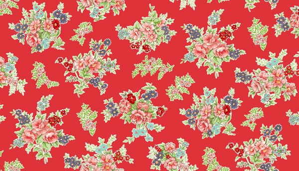 Charming floral collection in pretty shades of pink, turquoise and reds. A real vintage feel that would look equally good as clothing or quilts.